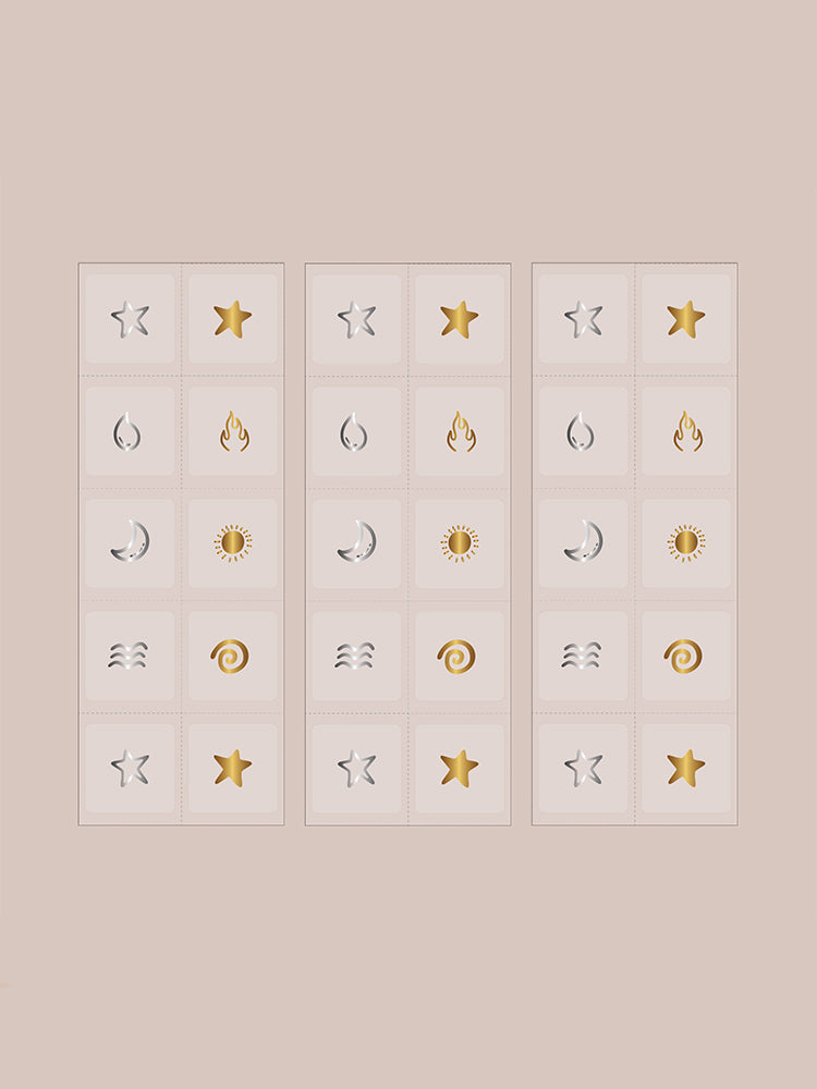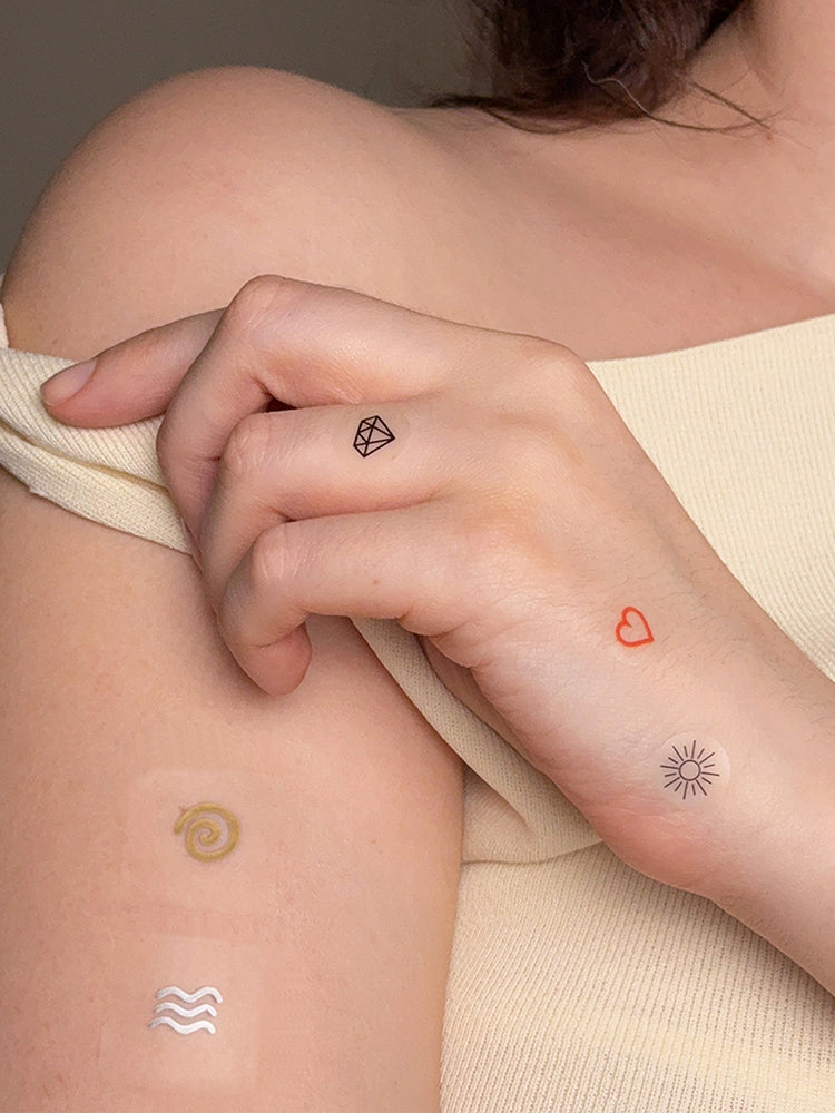 Ein Set enthält 36 Mini-Patches auf transparenter, recycelter PET-Folie mit schwarzem Motiv.
